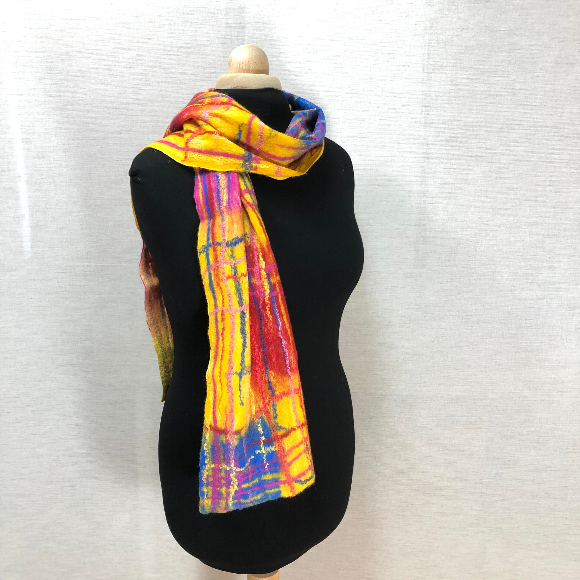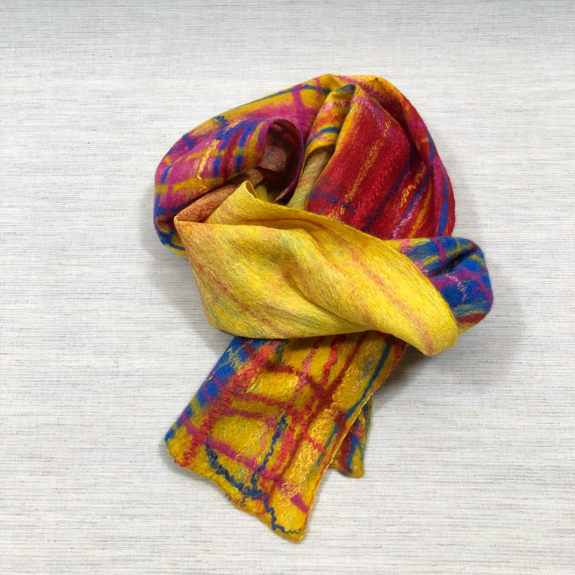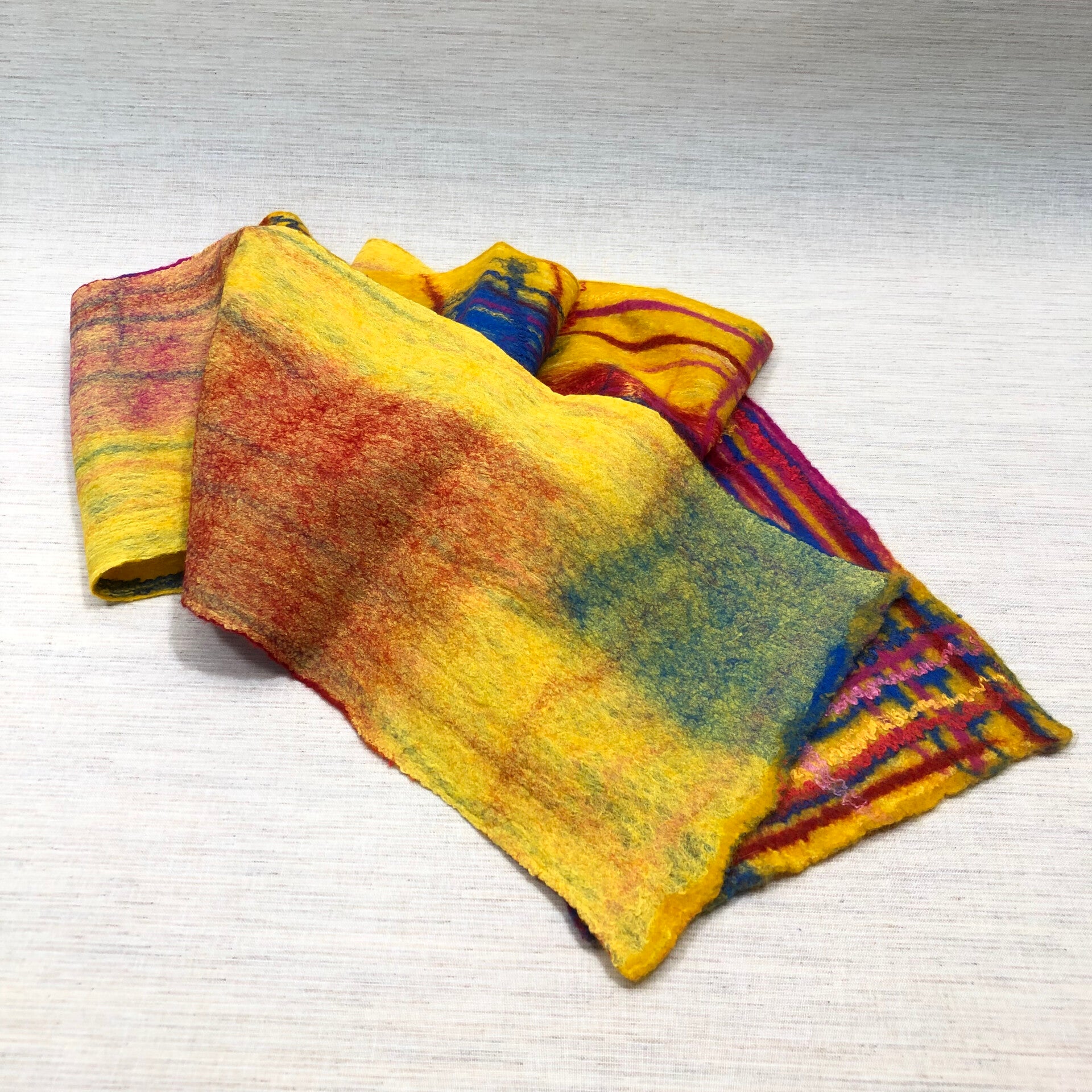 Mooie handgevilte sjaal van zijde chiffon en merinoswol in geel met blauw, rood en roze.