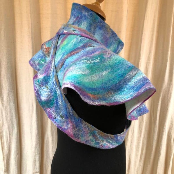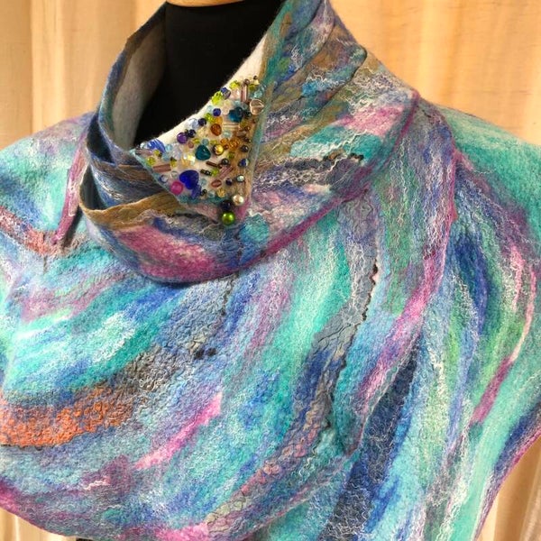 Handgevilte kraag en schouderwarmer van merinoswol, zijdevezels, chiffonzijde en pongezijde in een uniek spiraalvormig ontwerp.