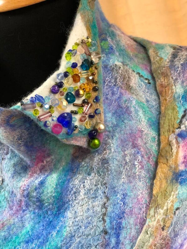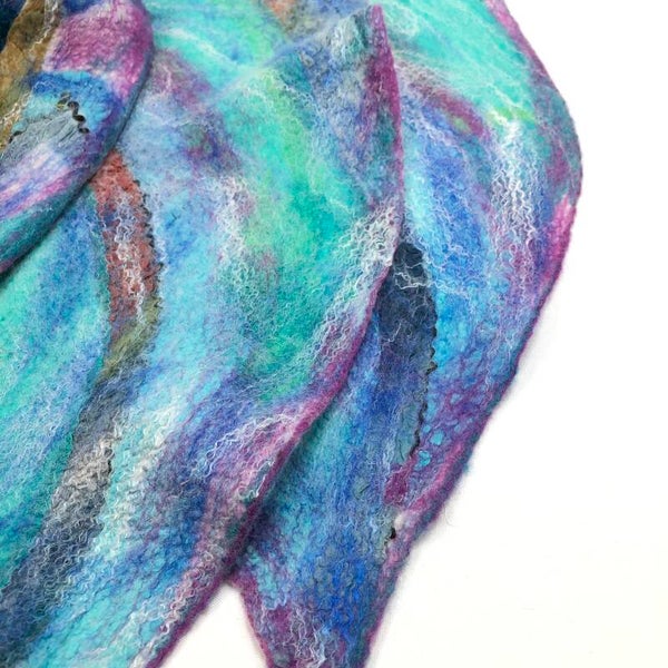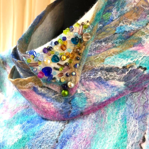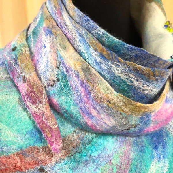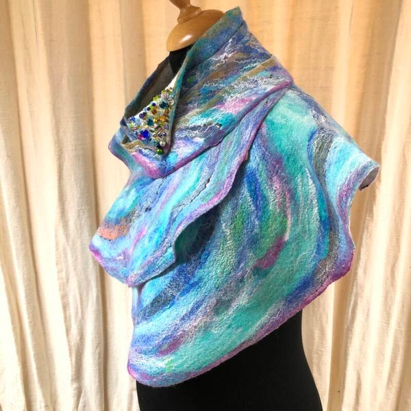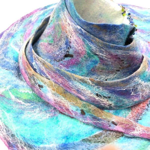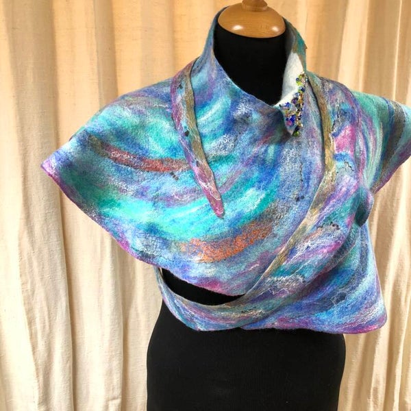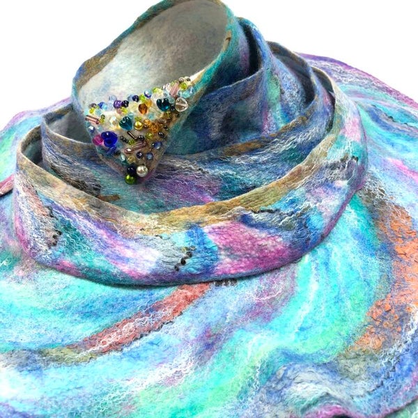 Details: Deze unieke kraag en schouderwarmer is met de hand gevilt, gebruikmakend van de nunofelt-techniek. De basis is een mengsel van witte merinoswol en zijde, waarop stroken van verschillende zijde stoffen en merinoswol in een spiraalvorm zijn gevilt. Dit resulteert in een prachtig, uniek ontwerp dat zowel warmte als stijl biedt. De kraag sluit met een drukknoop, wat zorgt voor een gemakkelijke en comfortabele pasvorm. Deze elegante halswarmer is perfect voor dames en jonge meiden, en is een prachtig cadeau om te geven of te ontvangen.