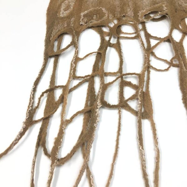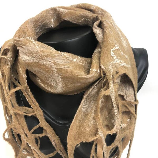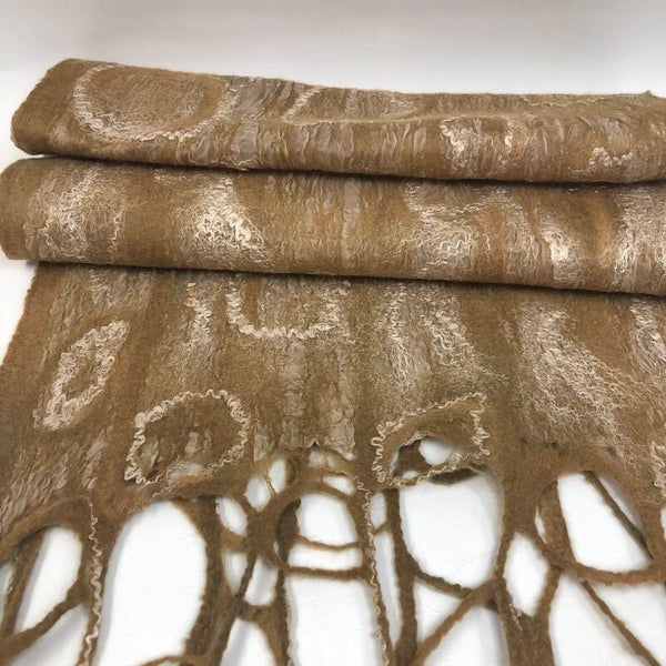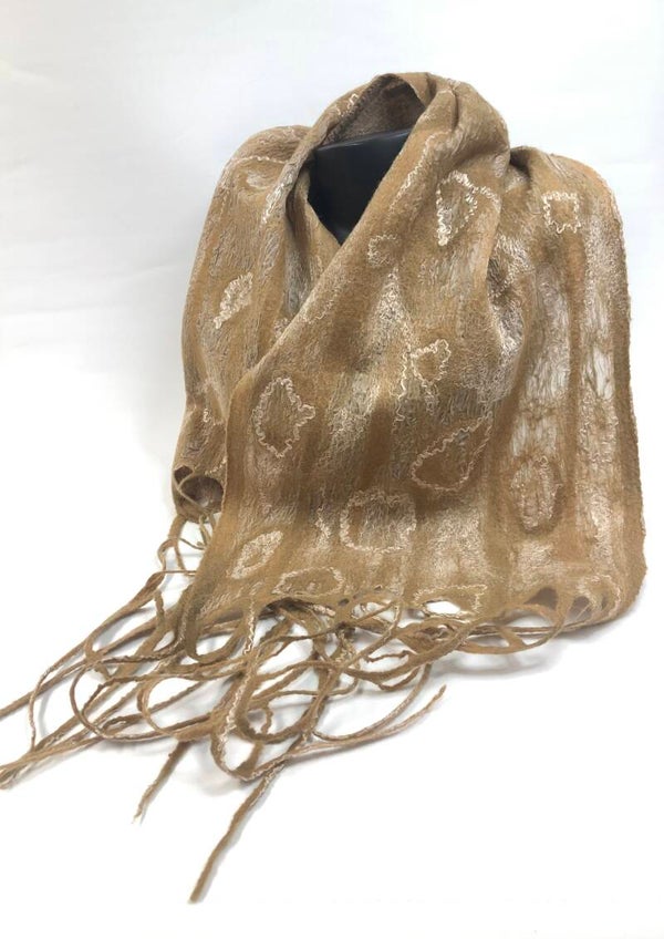 Deze sjaal is met de hand gevilt en combineert de luxe texturen van merinoswol en margilan zijde. De prachtige cappuccinokleur geeft de sjaal een tijdloze en verfijnde uitstraling, geschikt voor diverse gelegenheden. Het ontwerp is zorgvuldig vervaardigd om zowel stijl als comfort te bieden, met een vleugje elegantie dankzij de glans van de zijdevezels.
