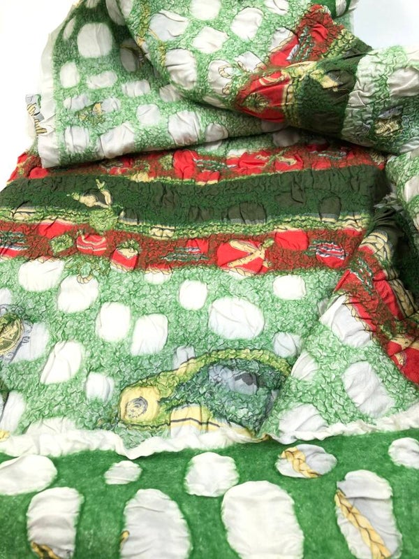 Deze unieke infinity sjaal is met de hand gevilt, waarbij gebruik is gemaakt van de nunofelt-techniek. Het ontwerp combineert een levendige groene kleur met kleurrijke accenten van wit, rood en geel. In de sjaal zijn verschillende "restjes" van zijde stoffen verwerkt, wat zorgt voor een interessante textuur en een dynamisch patroon. De sjaal is ontworpen om twee keer om de hals gewikkeld te worden, wat zorgt voor extra warmte en een stijlvolle look. Dit veelzijdige accessoire is perfect voor koude dagen en voegt een kleurrijke en artistieke touch toe aan elke outfit.