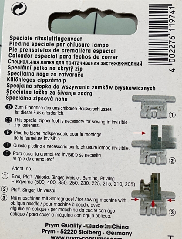 Met deze speciale ritsvoet naait u blinde ritssluitingen moeiteloos en professioneel. De kunststof ritsvoet is ontworpen voor precisie en eenvoudige montage met een van de meegeleverde adapters. Geschikt voor verschillende merken zoals Singer, Elna, Bernina, Pfaff, Master, Privileg en Universal, inclusief naaimachines met schuine naalden.