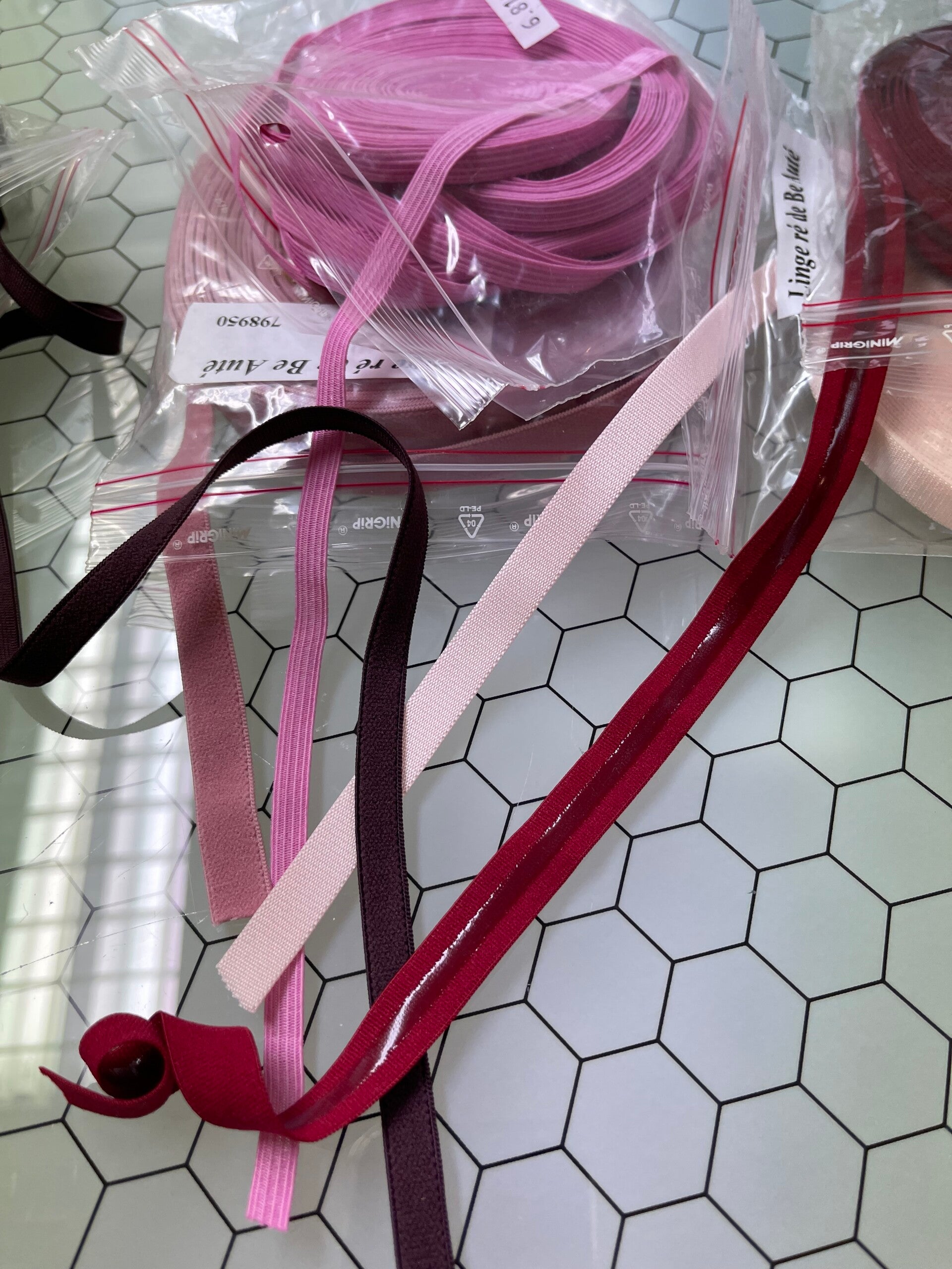 Mix van rood en roze lingeriematerialen, bestaande uit 3 zakken elastiek en 2 zakken schouderbanden. Elk zakje bevat ongeveer 10 meter materiaal.