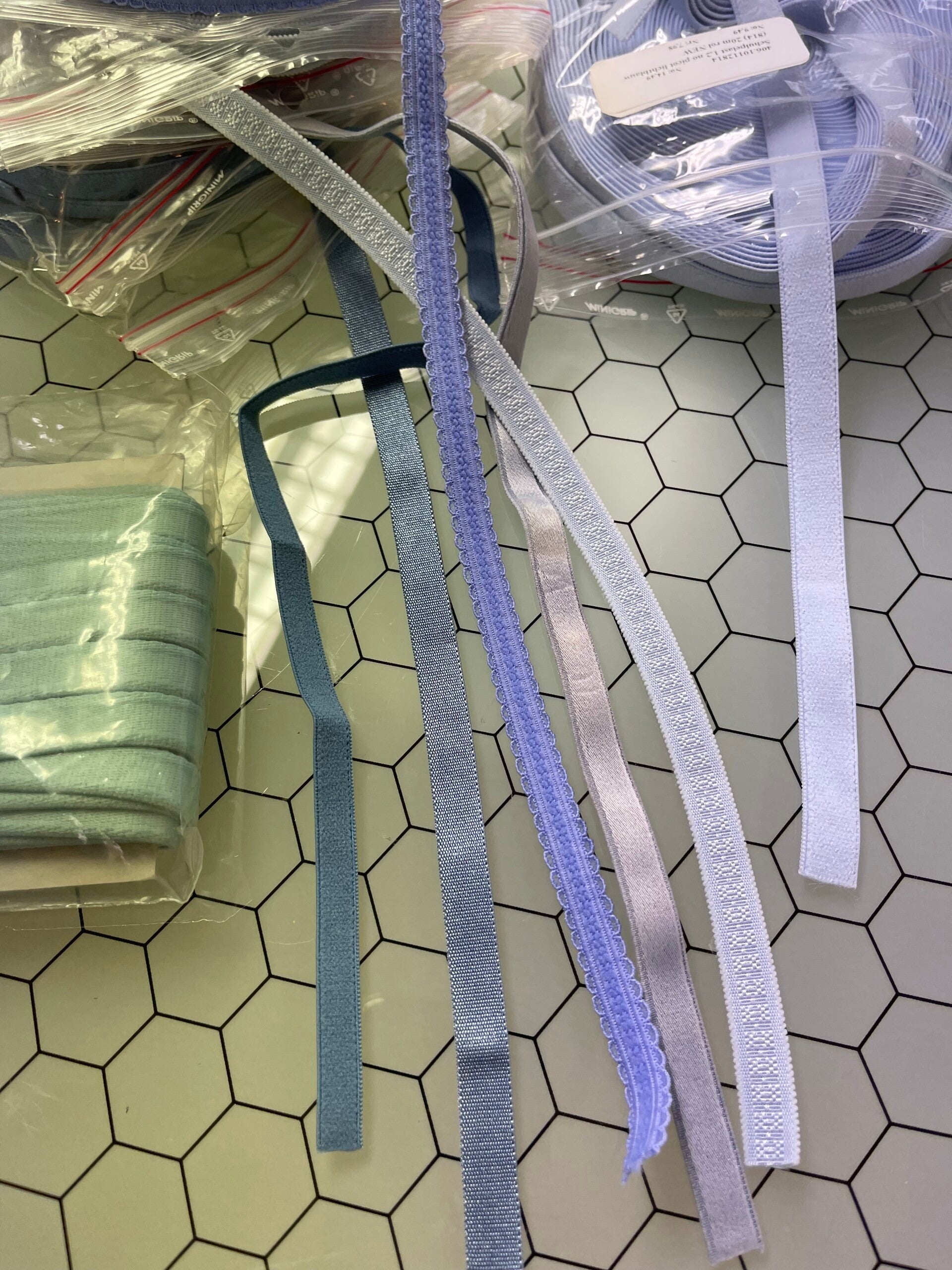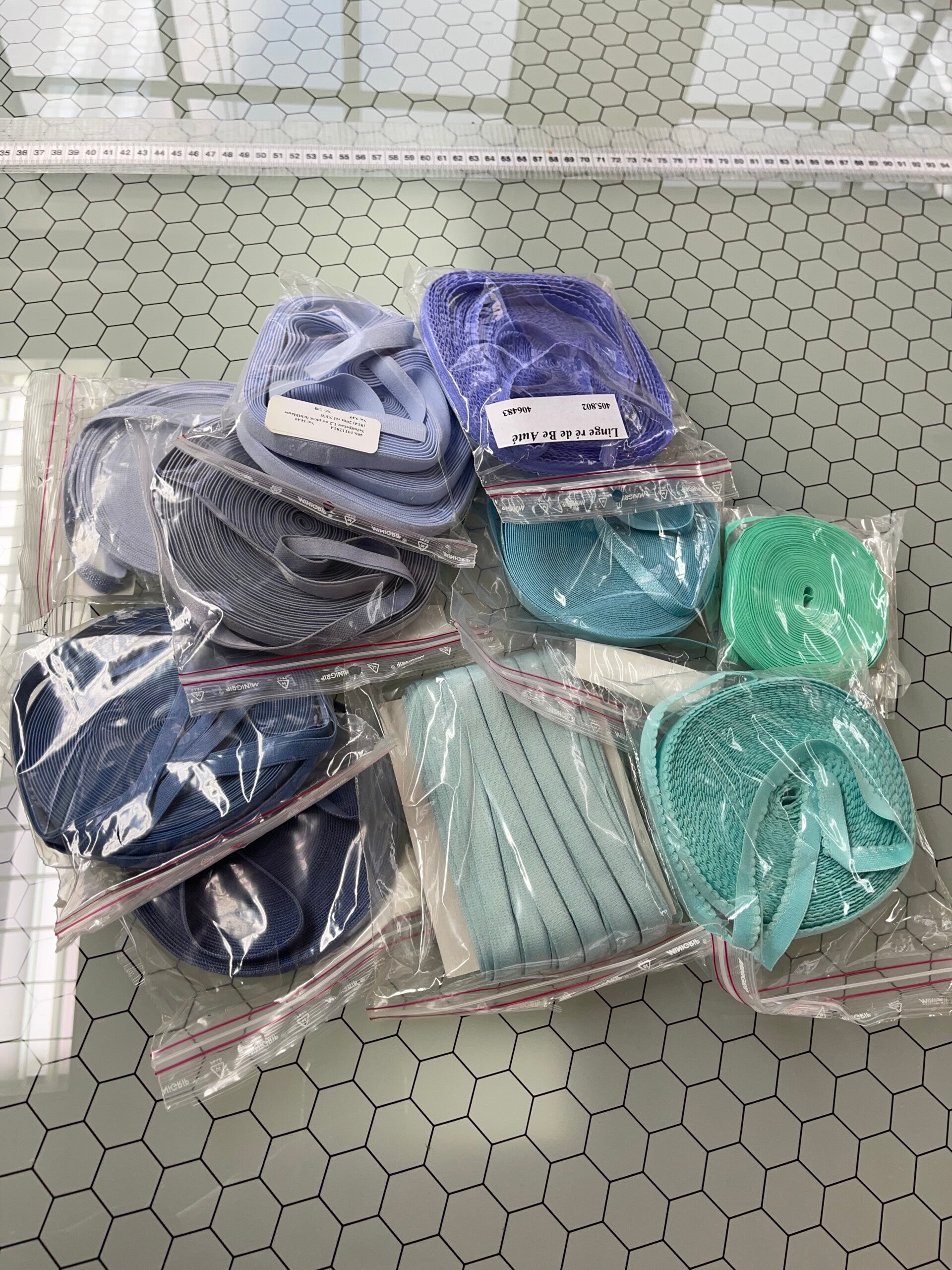 Mix van lingeriematerialen in blauwtinten, bestaande uit een totaal van 10 zakken met elk ongeveer 10 meter materiaal. De set bevat een combinatie van: