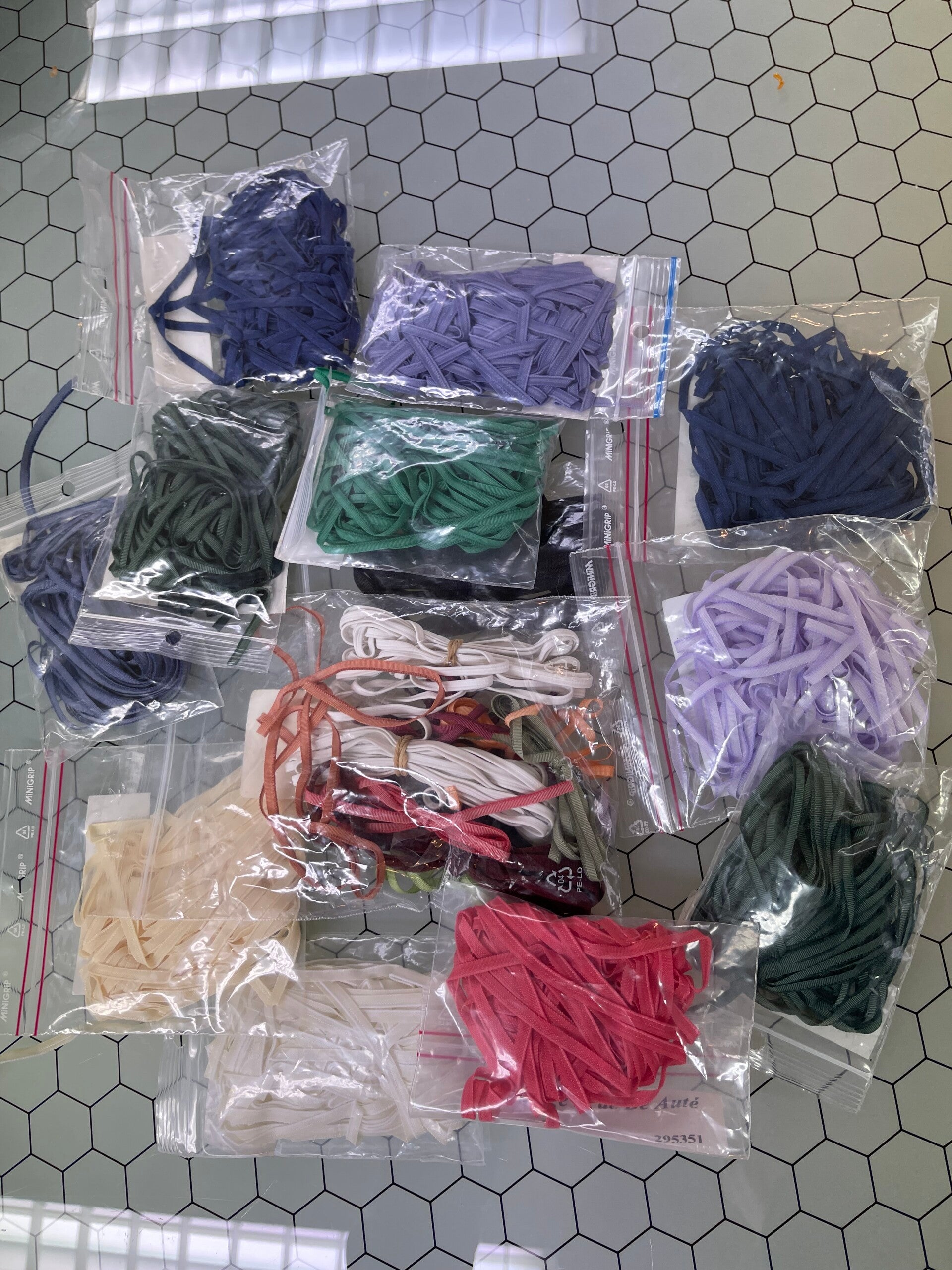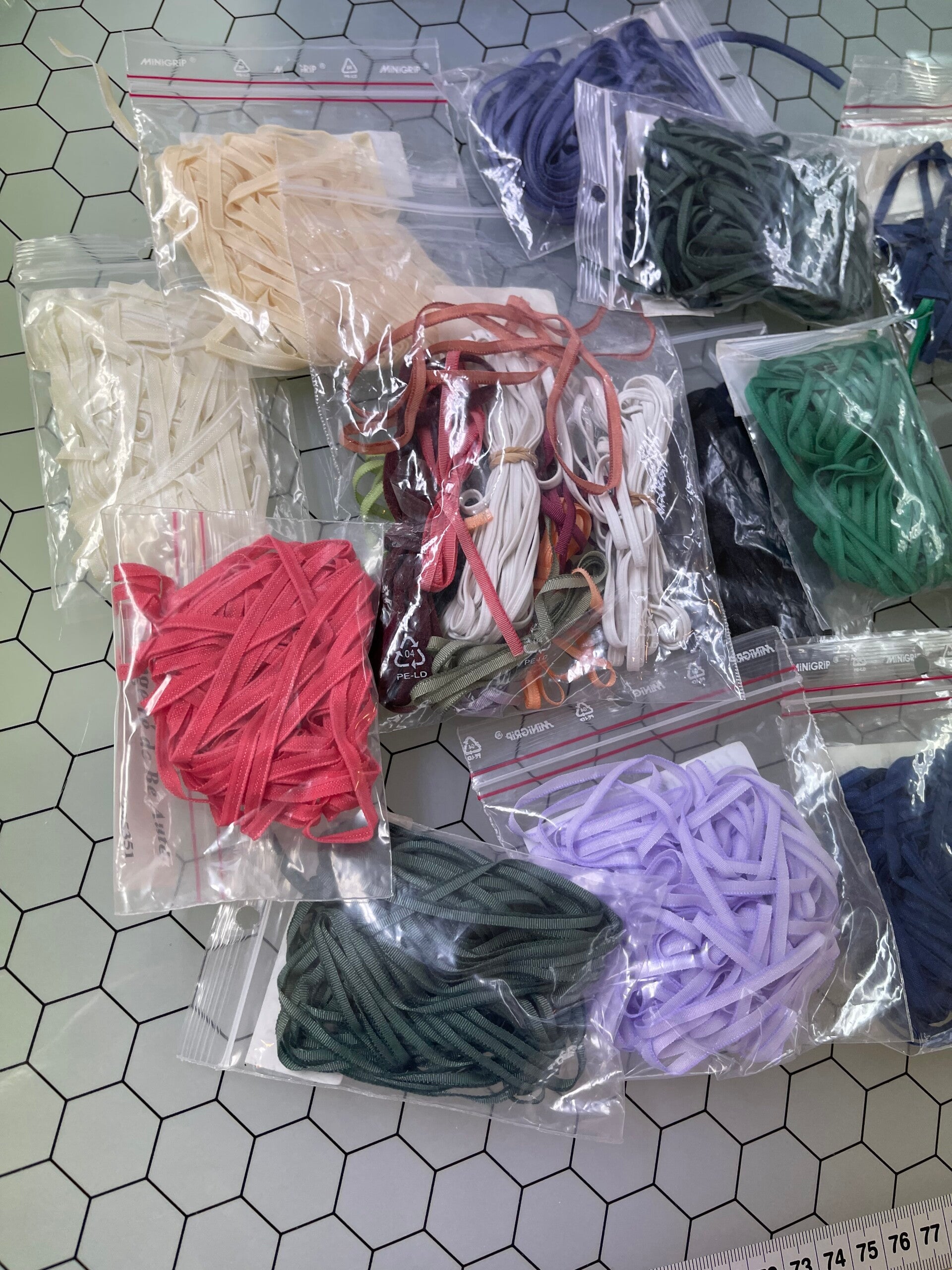 Mix van verschillende kleuren lingerie-elastiek, perfect voor het afwerken van de zelfkant van kanten bovencups en andere lingerieprojecten.