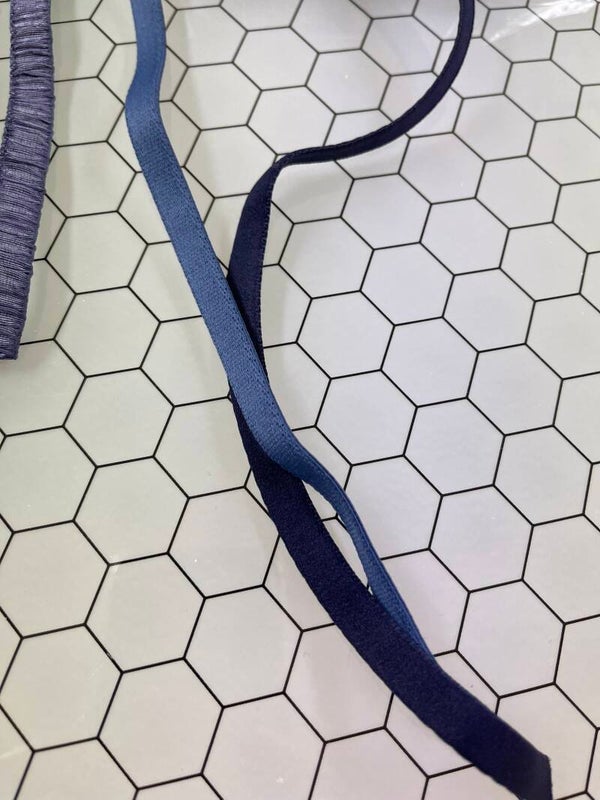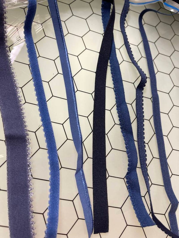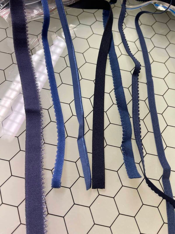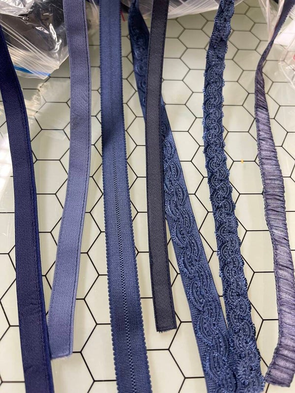 Set van 17 zakken met diverse donkerblauwe lingeriematerialen, ideaal voor het maken en afwerken van lingerie en badkleding. In elk zak ongeveer 10 meter materiaal.