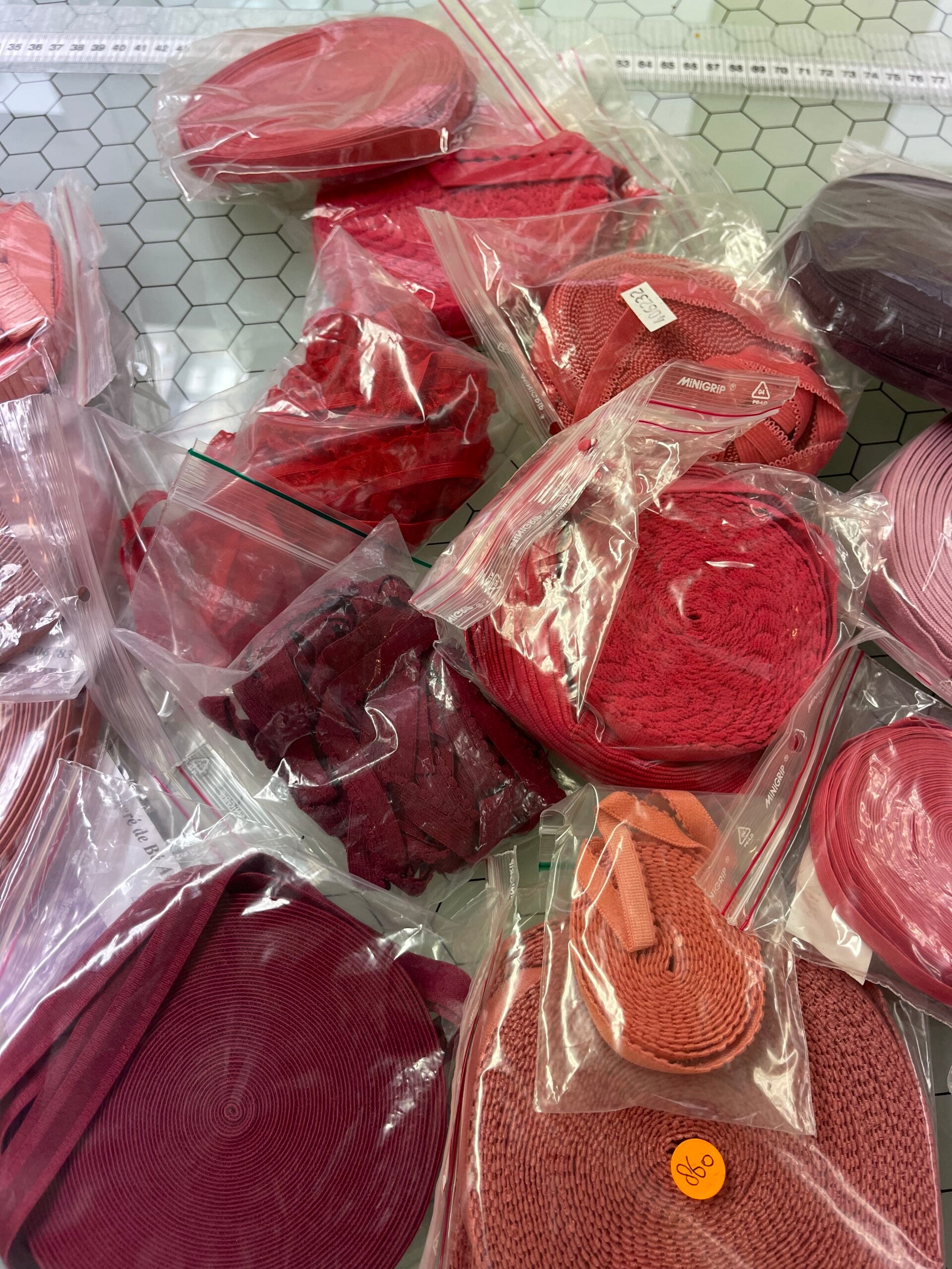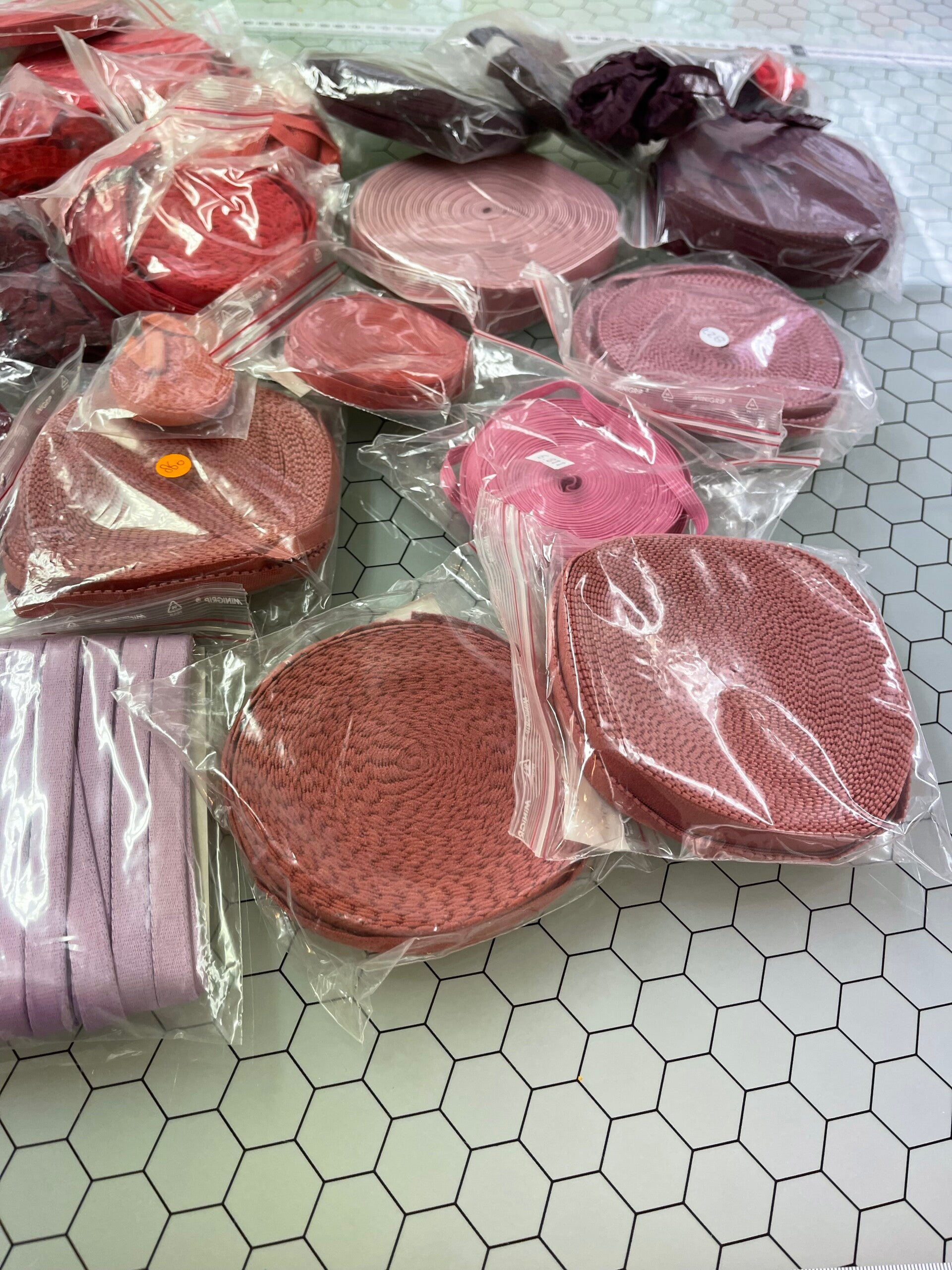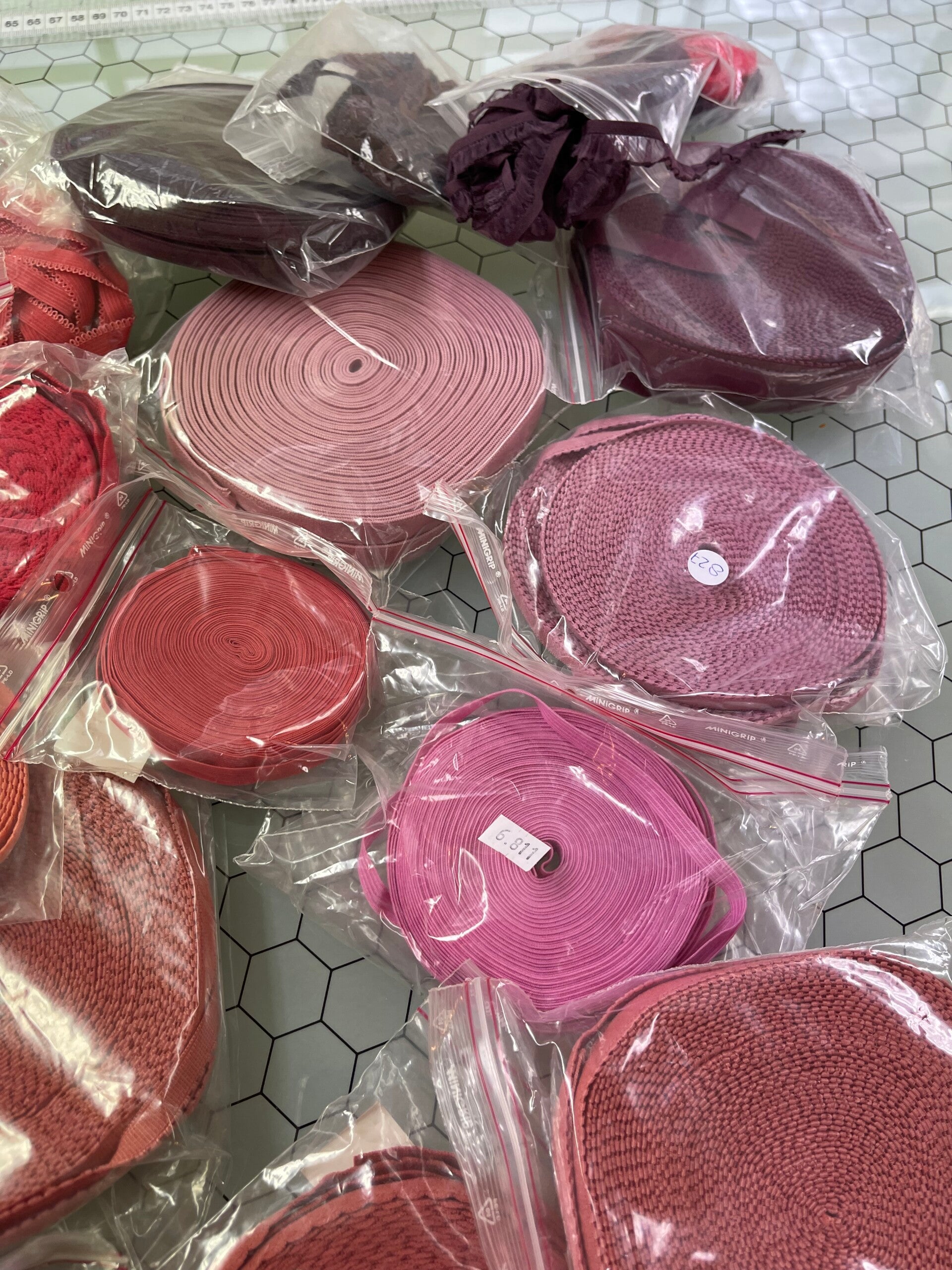 Set van 26 zakken lingeriematerialen in rood- lila en roze tinten, met elk ongeveer 10 meter inhoud. De mix bevat:
