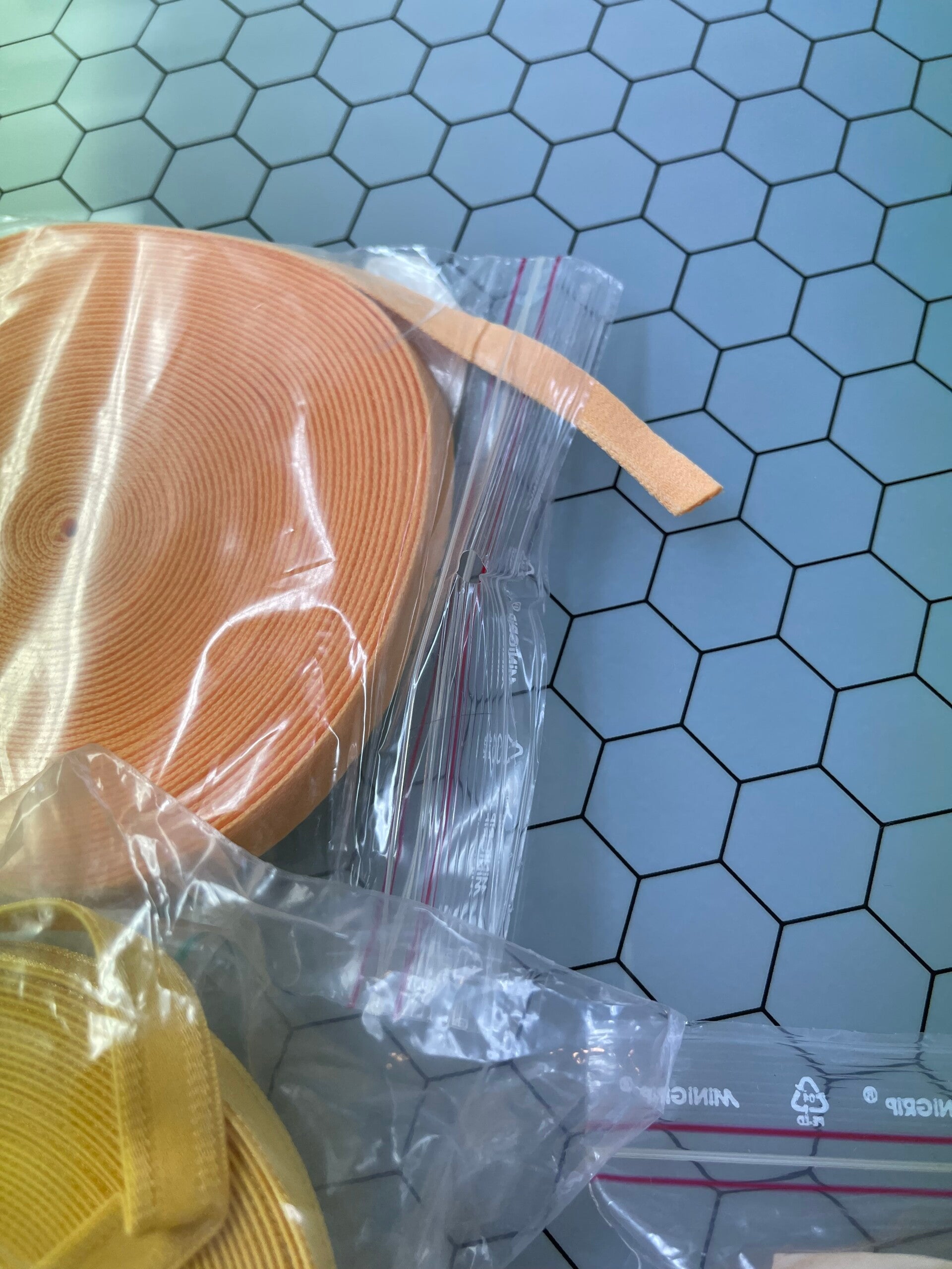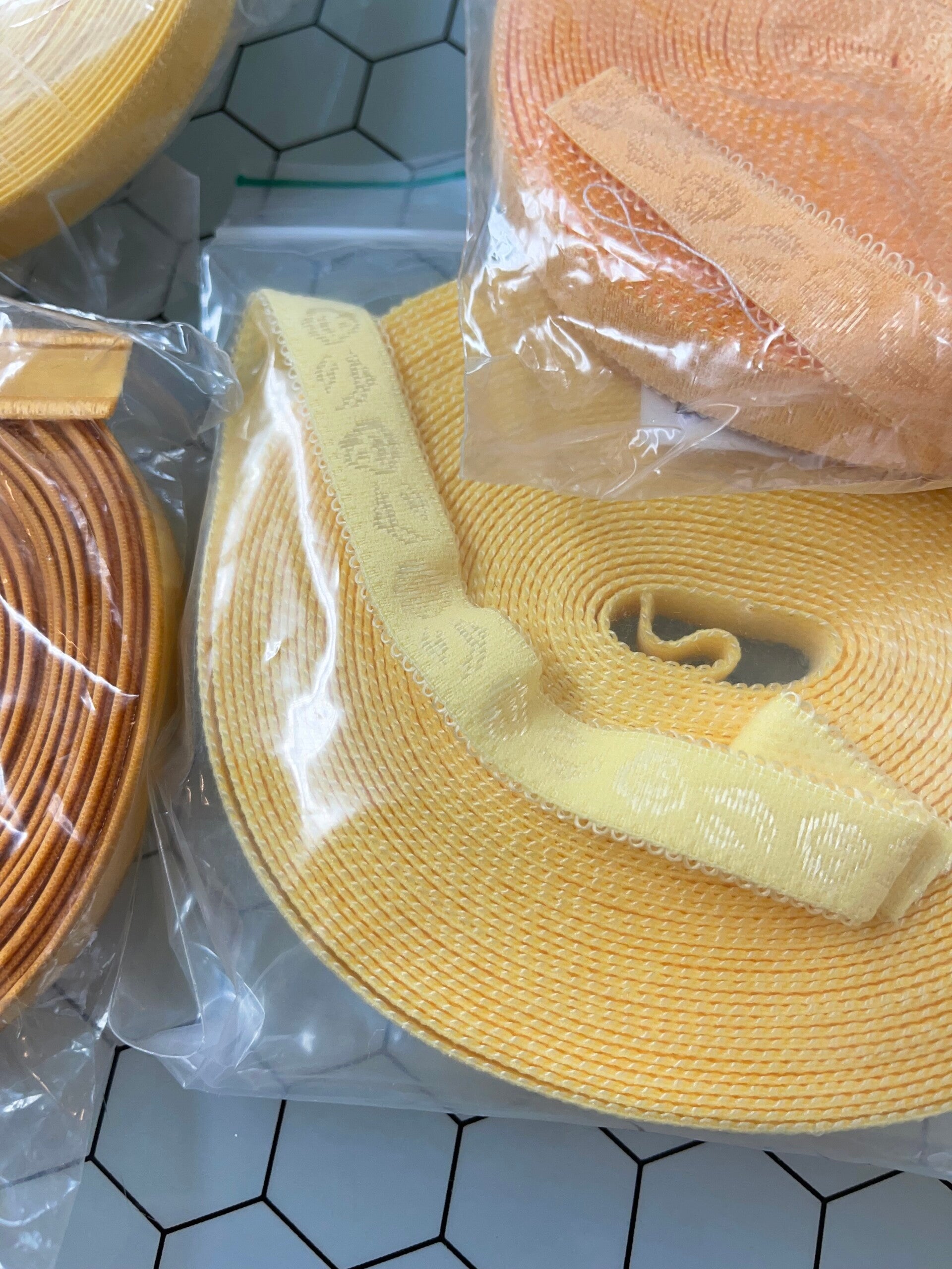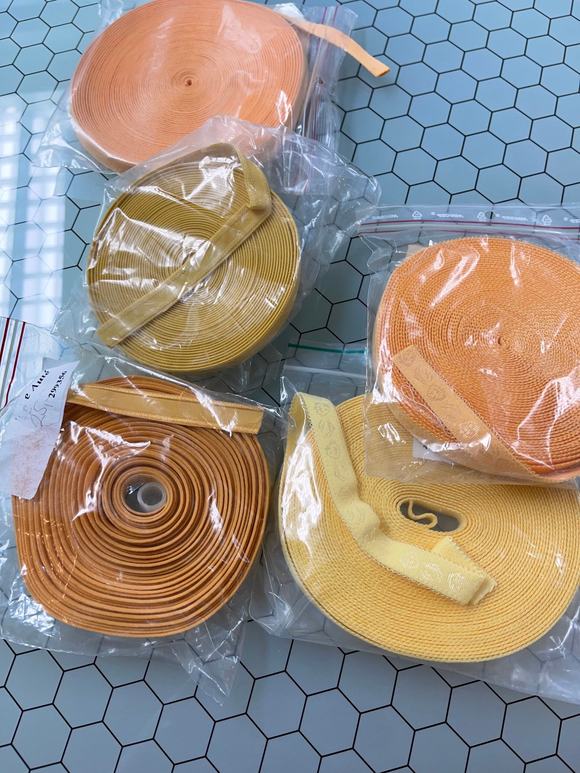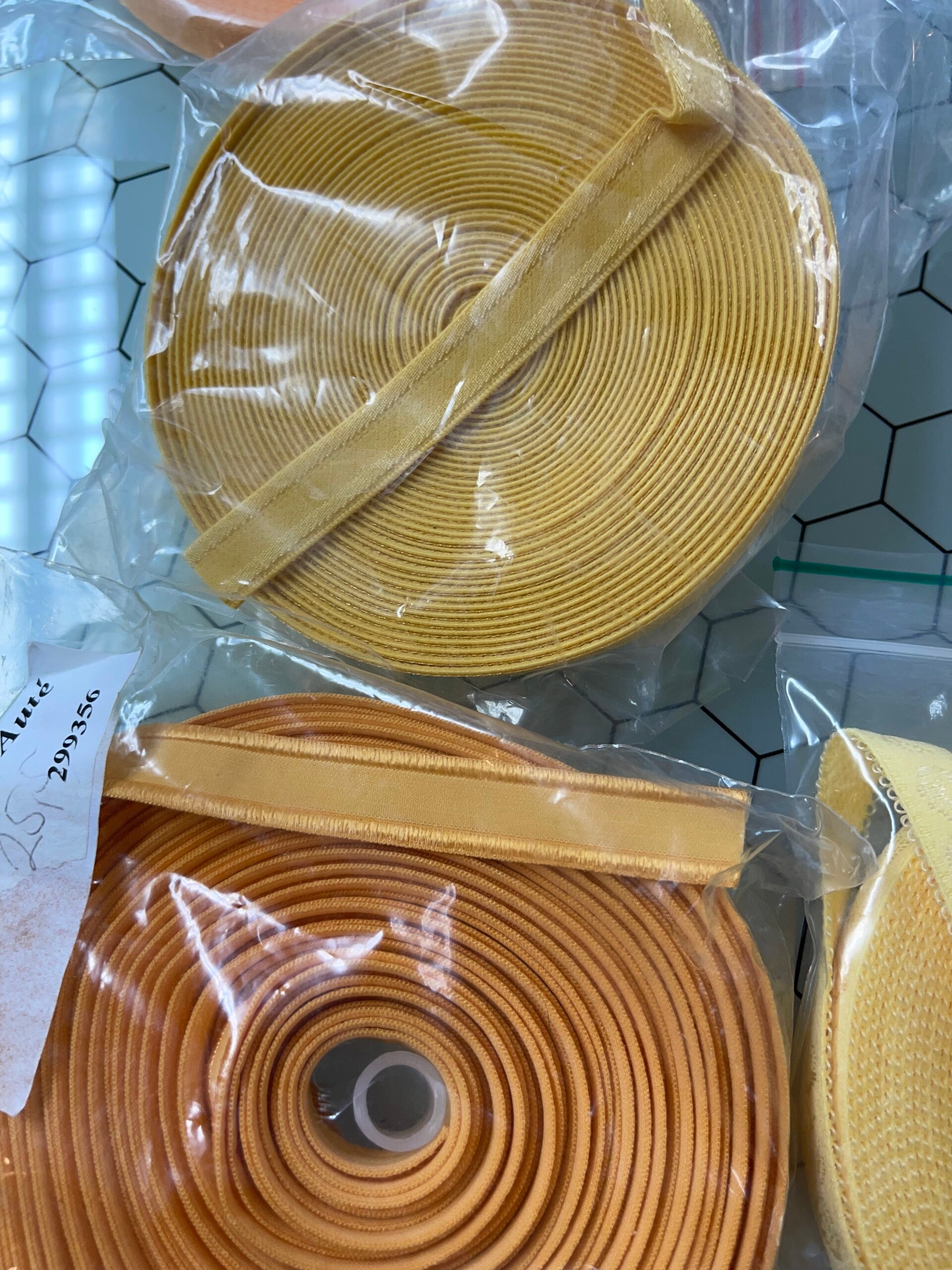 Gele mix van lingeriematerialen, bestaande uit 5 zakken met elk ongeveer 10 meter materiaal. De set bevat: