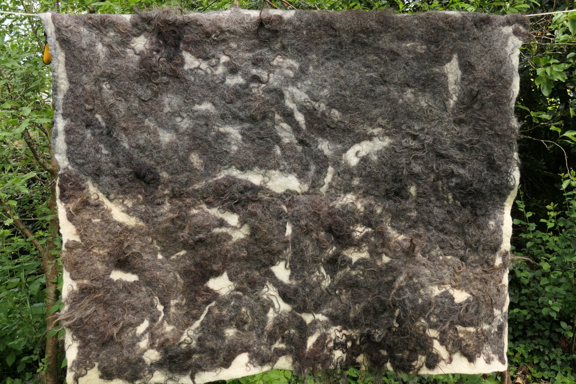 Dit kleed is met de hand gevilt met water en zeep, volledig zonder chemicaliën. Het resultaat is een duurzaam, stevig en toch zacht kleed dat zowel functioneel als decoratief is. Gebruik het als vloerkleed voor extra warmte of hang het aan de muur als kunstzinnige blikvanger.