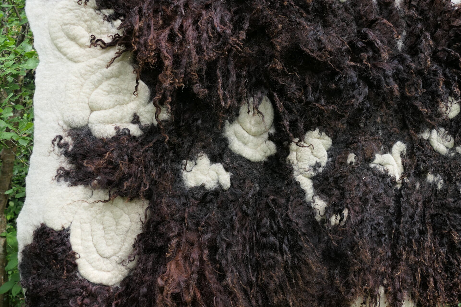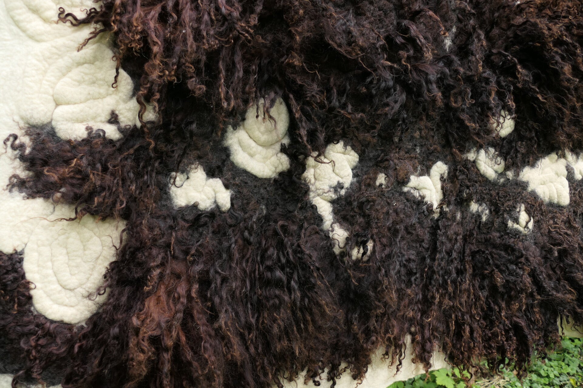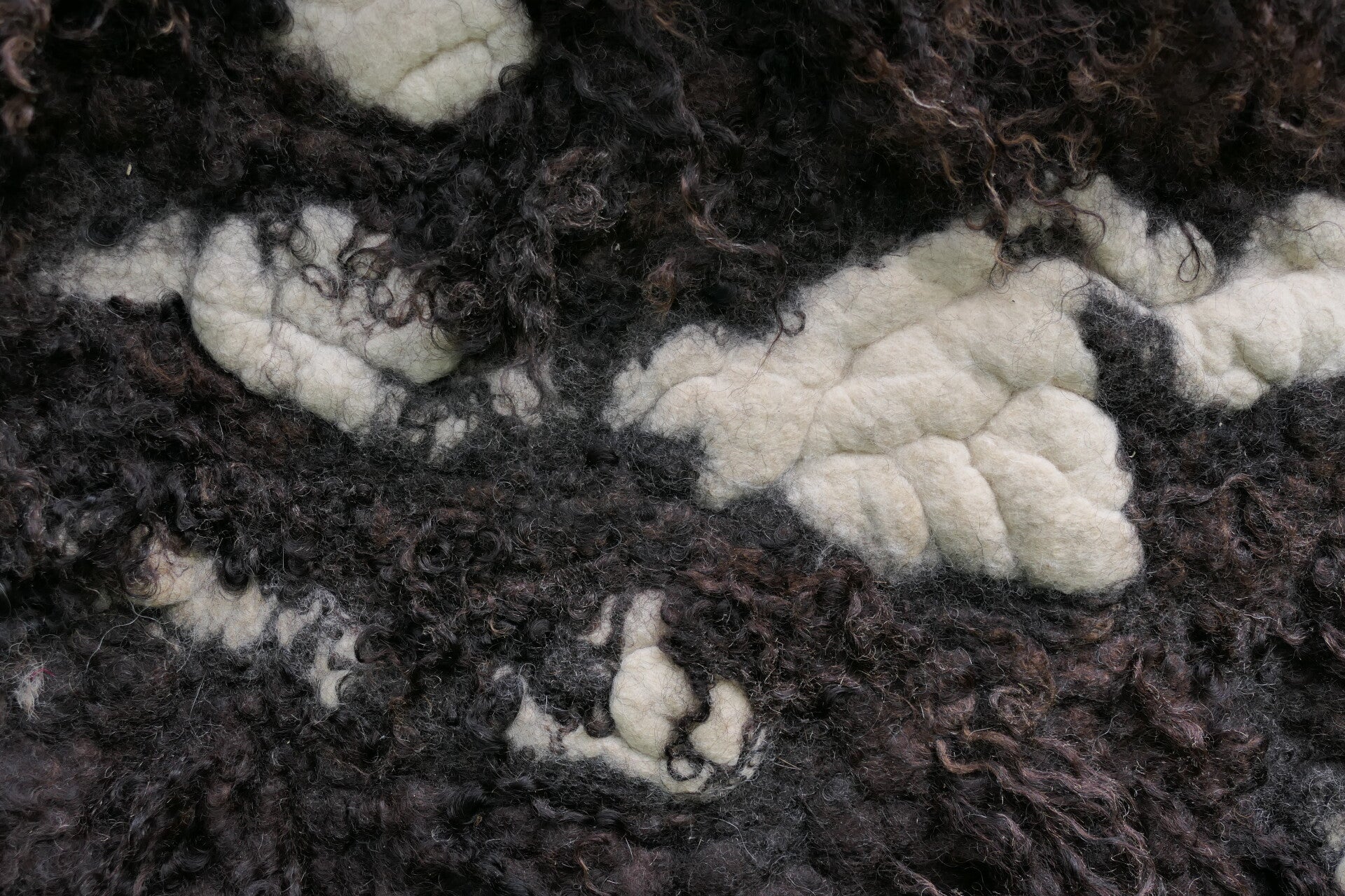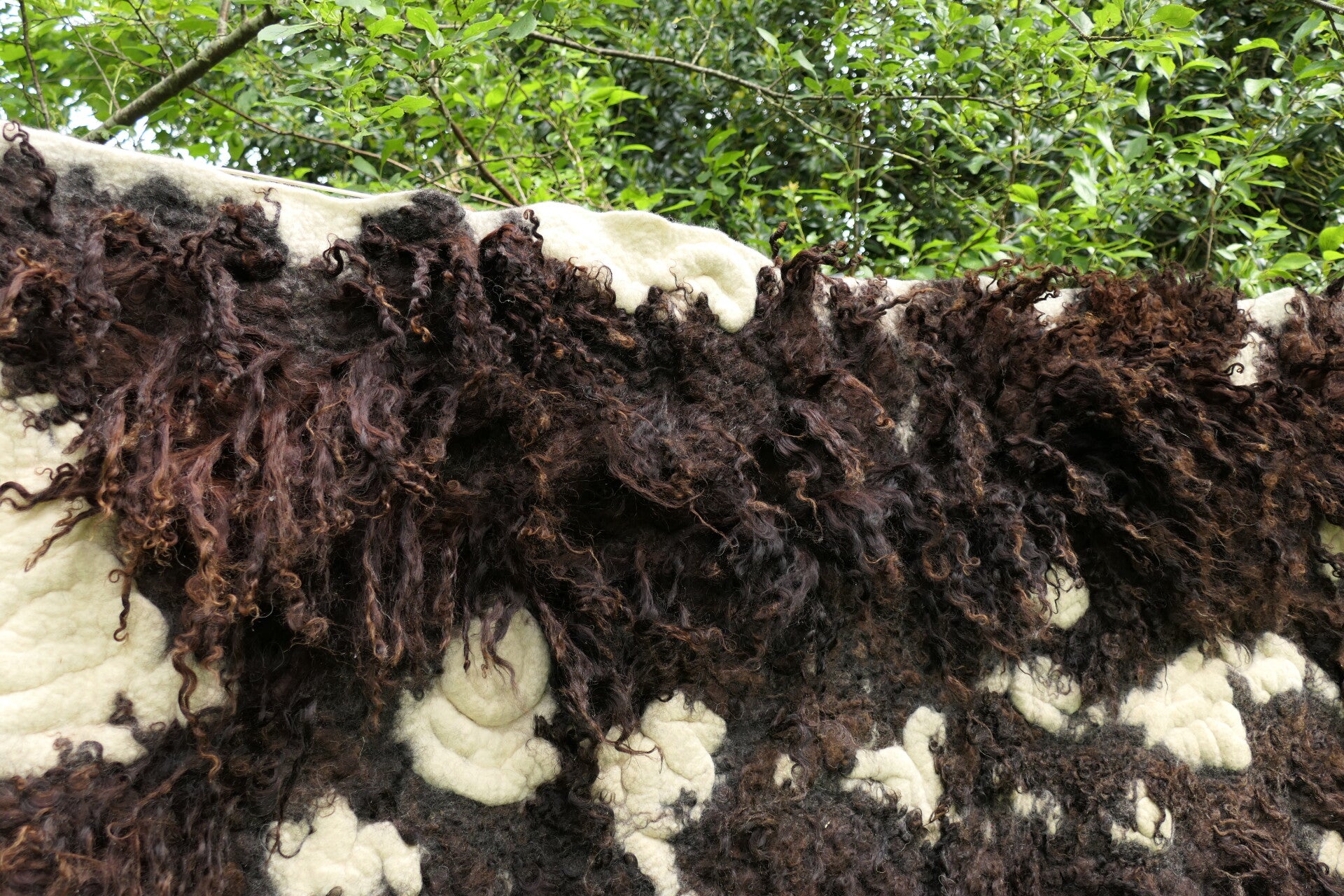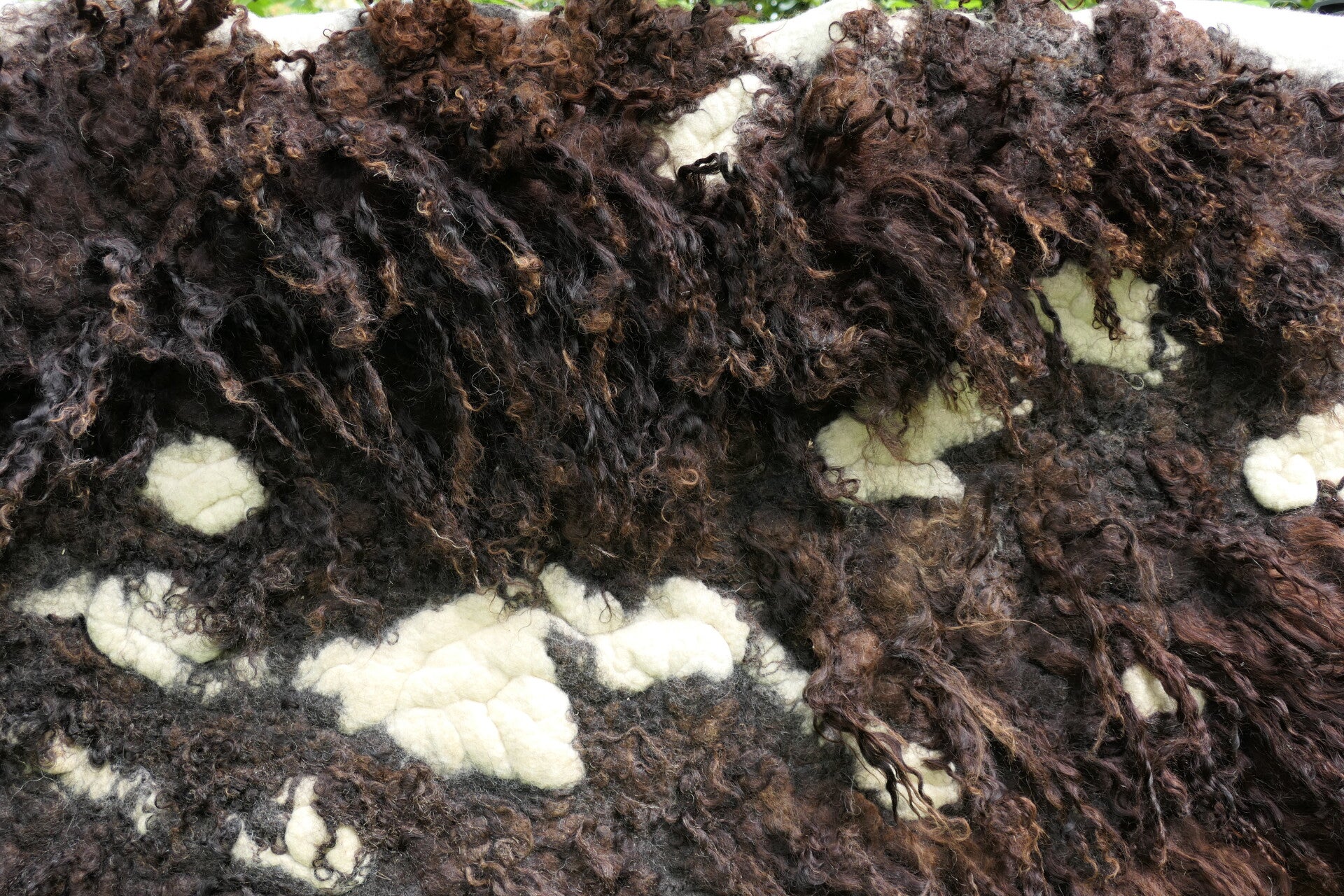 Voeg een opvallend kunstwerk toe aan je interieur met dit grote, handgevilte wandkleed van donkerbruine Racka schapenwol met lange lokken. Het cremewitte spiraalmotief tussen de donkere krullen creëert een krachtig contrast op de zachte, roomwitte achtergrond.