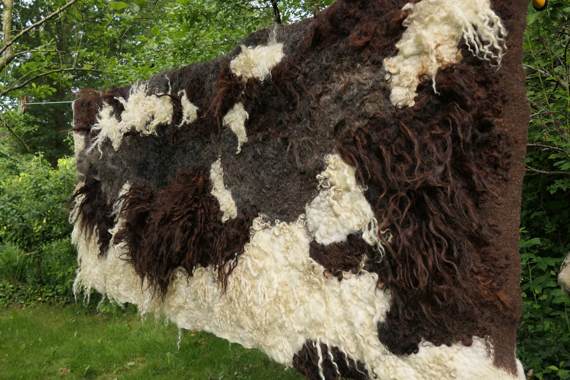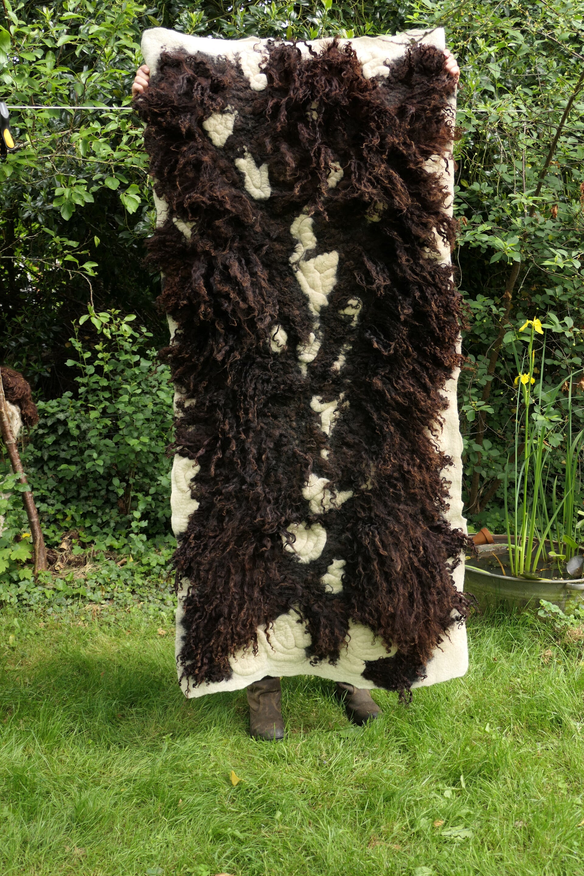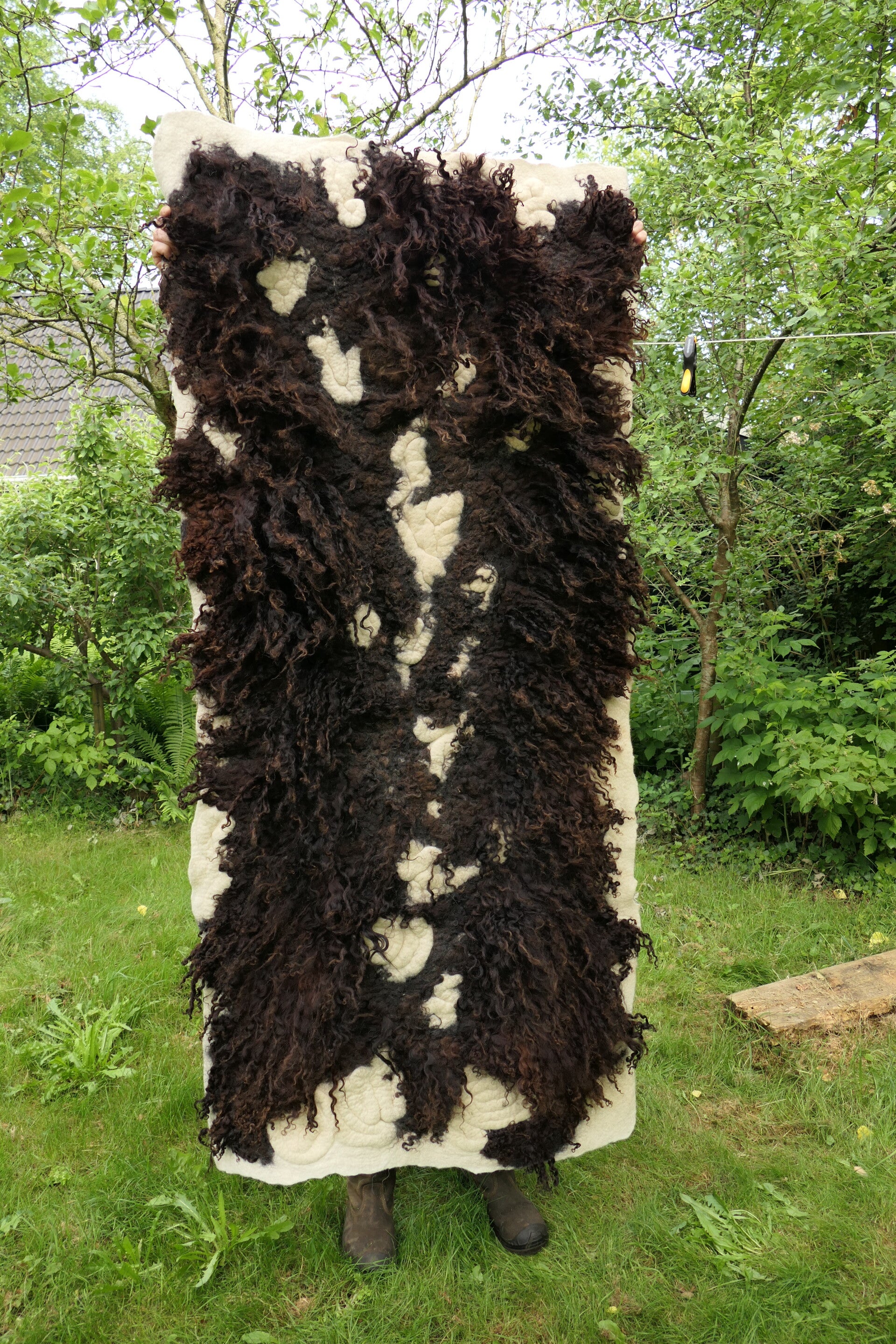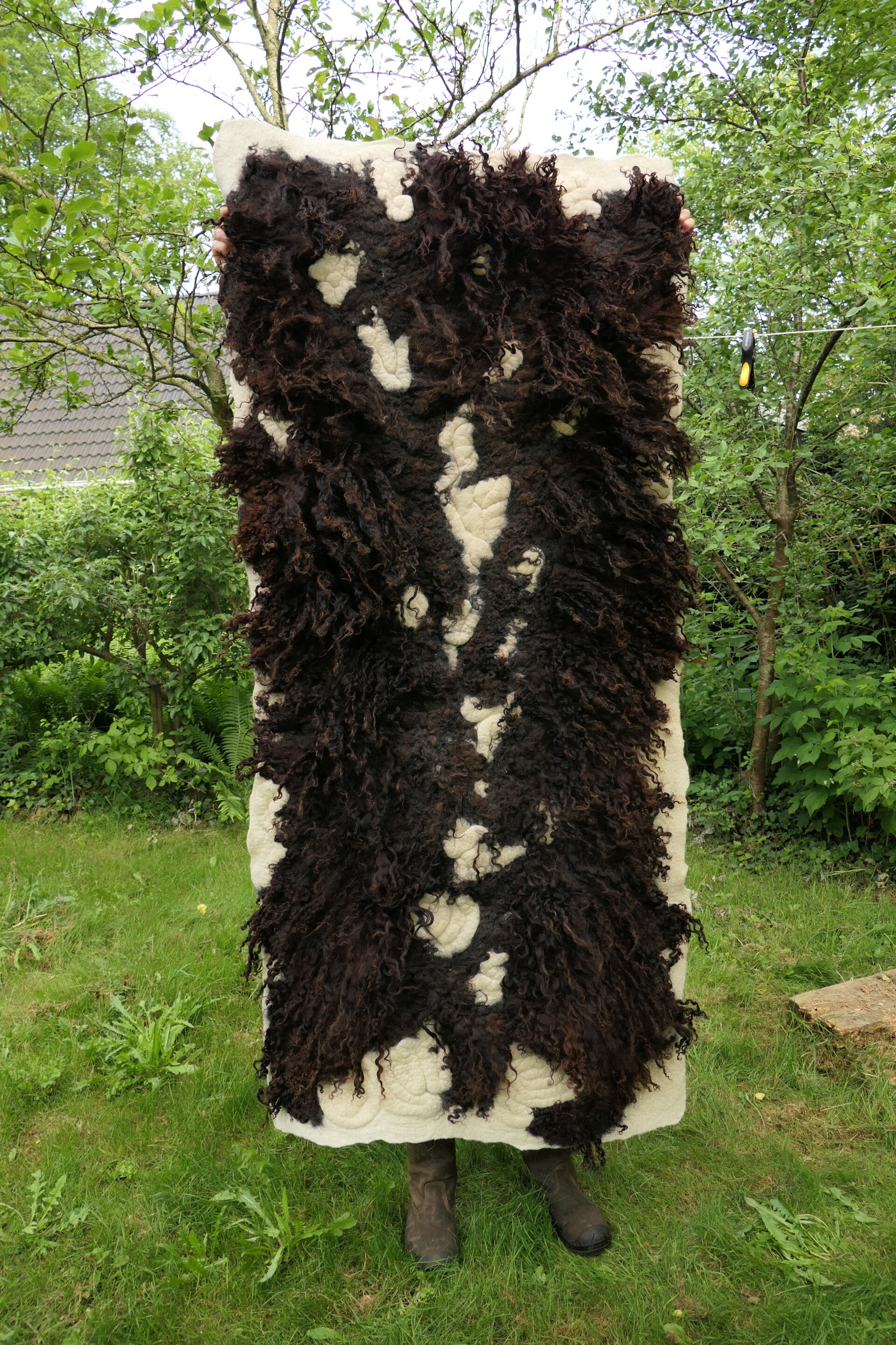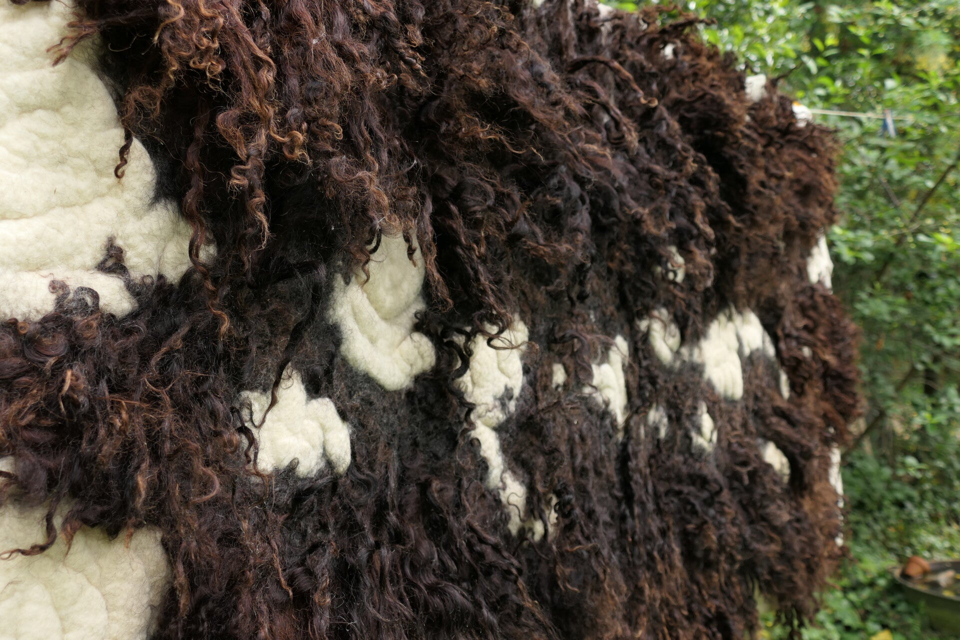 Voeg een opvallend kunstwerk toe aan je interieur met dit grote, handgevilte wandkleed van donkerbruine Racka schapenwol met lange lokken. Het cremewitte spiraalmotief tussen de donkere krullen creëert een krachtig contrast op de zachte, roomwitte achtergrond.