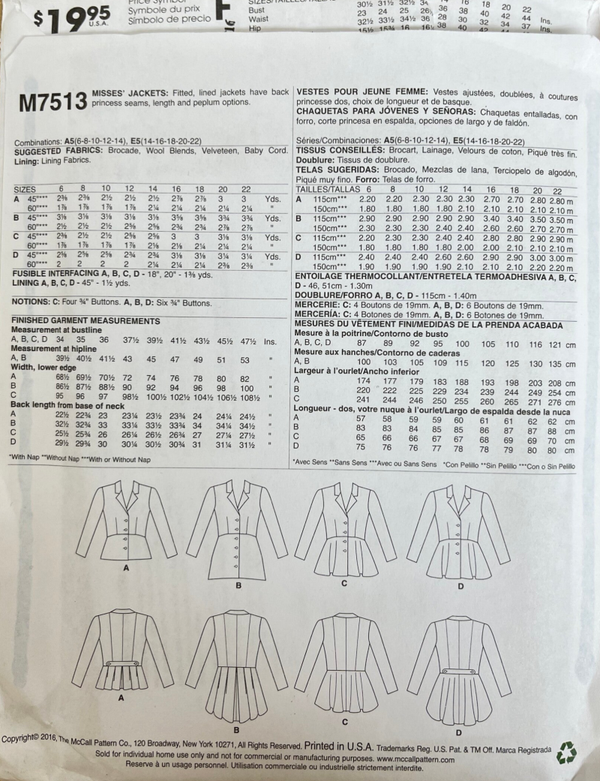 Naaipatroon McCall’s M7513 – Getailleerd damesjasje met variaties
