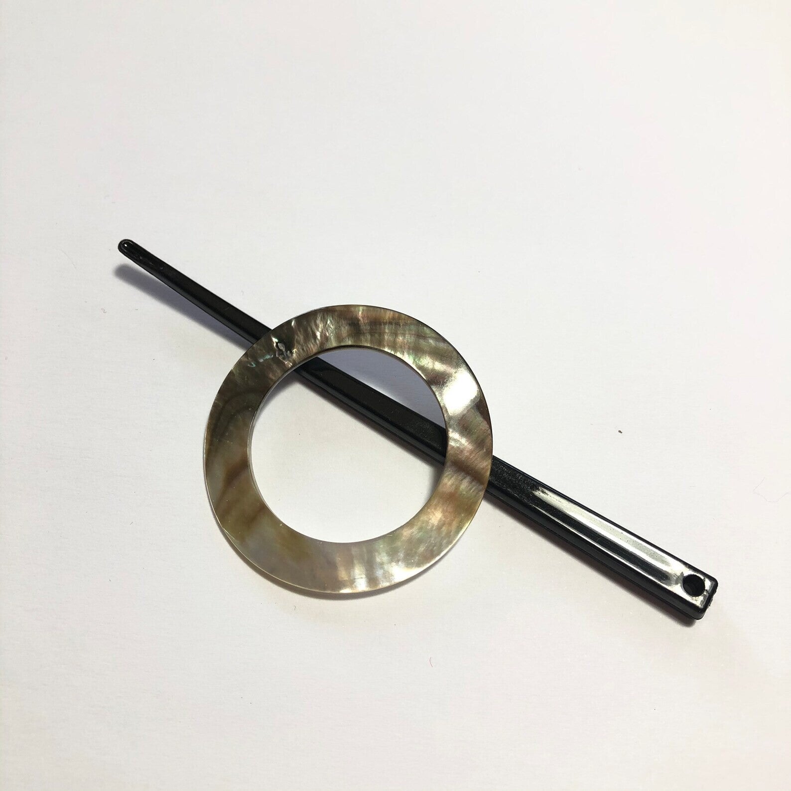 De ronde sluiting is gemaakt van glinsterende parelmoer, 5cm