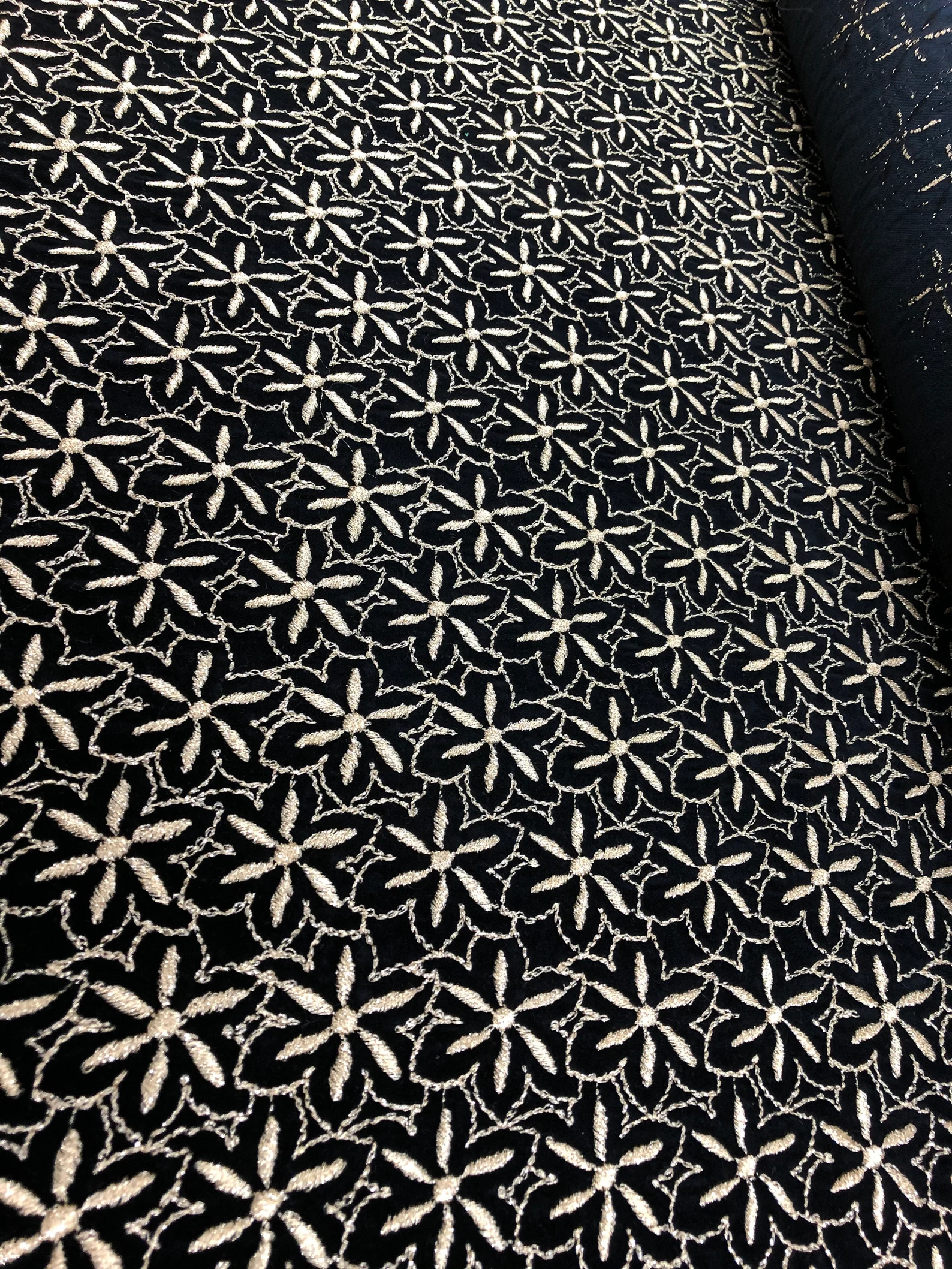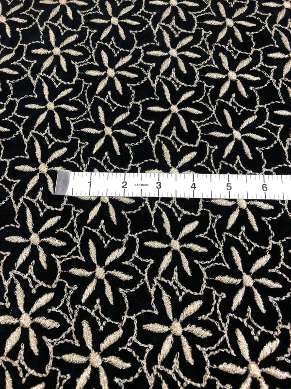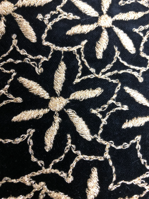 Prachtig fluweel stof met gouden geborduurde bloemen.70% Ca 30% CMD 260gr/m2 breedte 140cmMooi stof voor overgordijnen, meubel-bekleding kussens, tafellakens, servetten maar ook voor kleding.