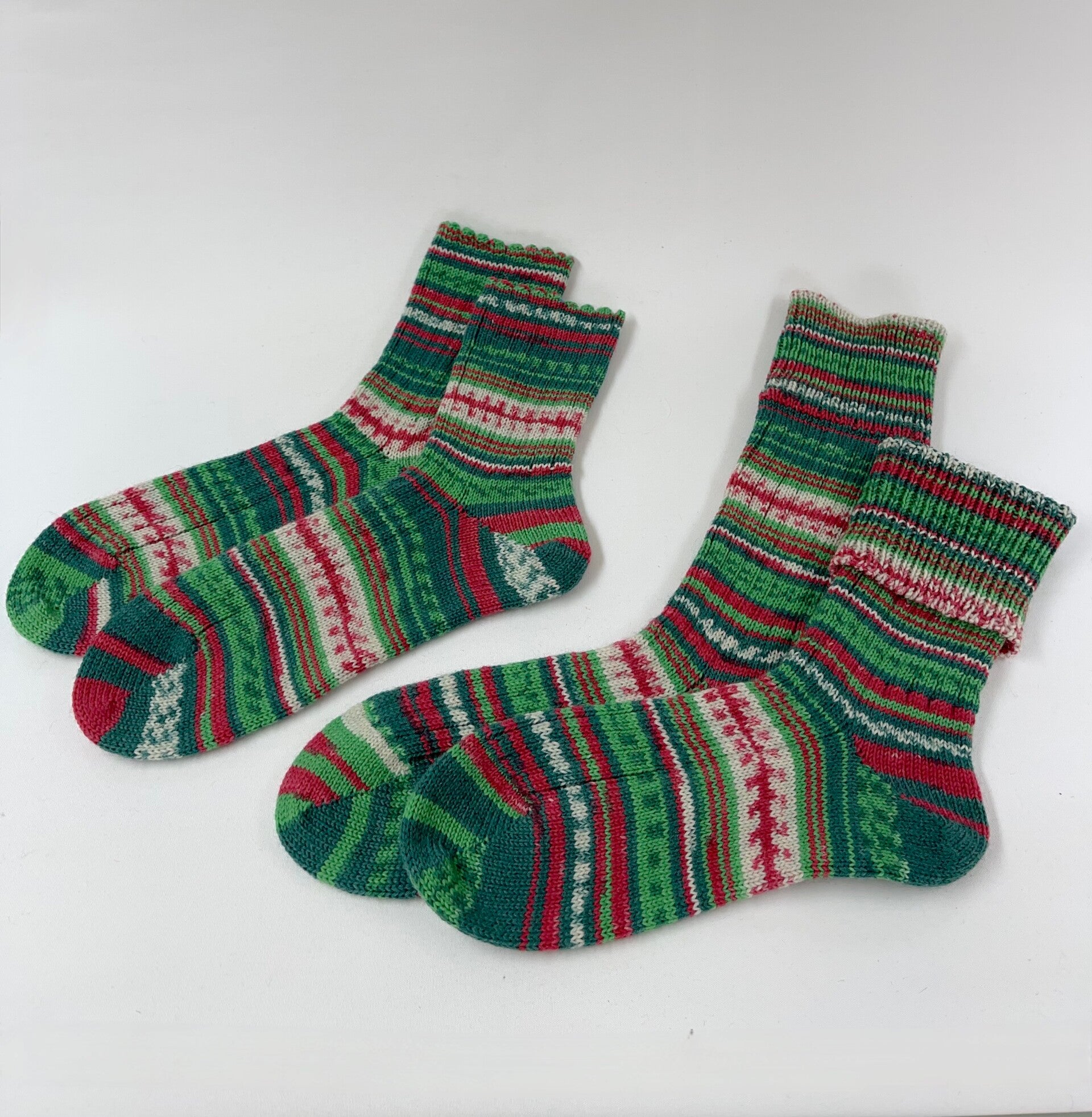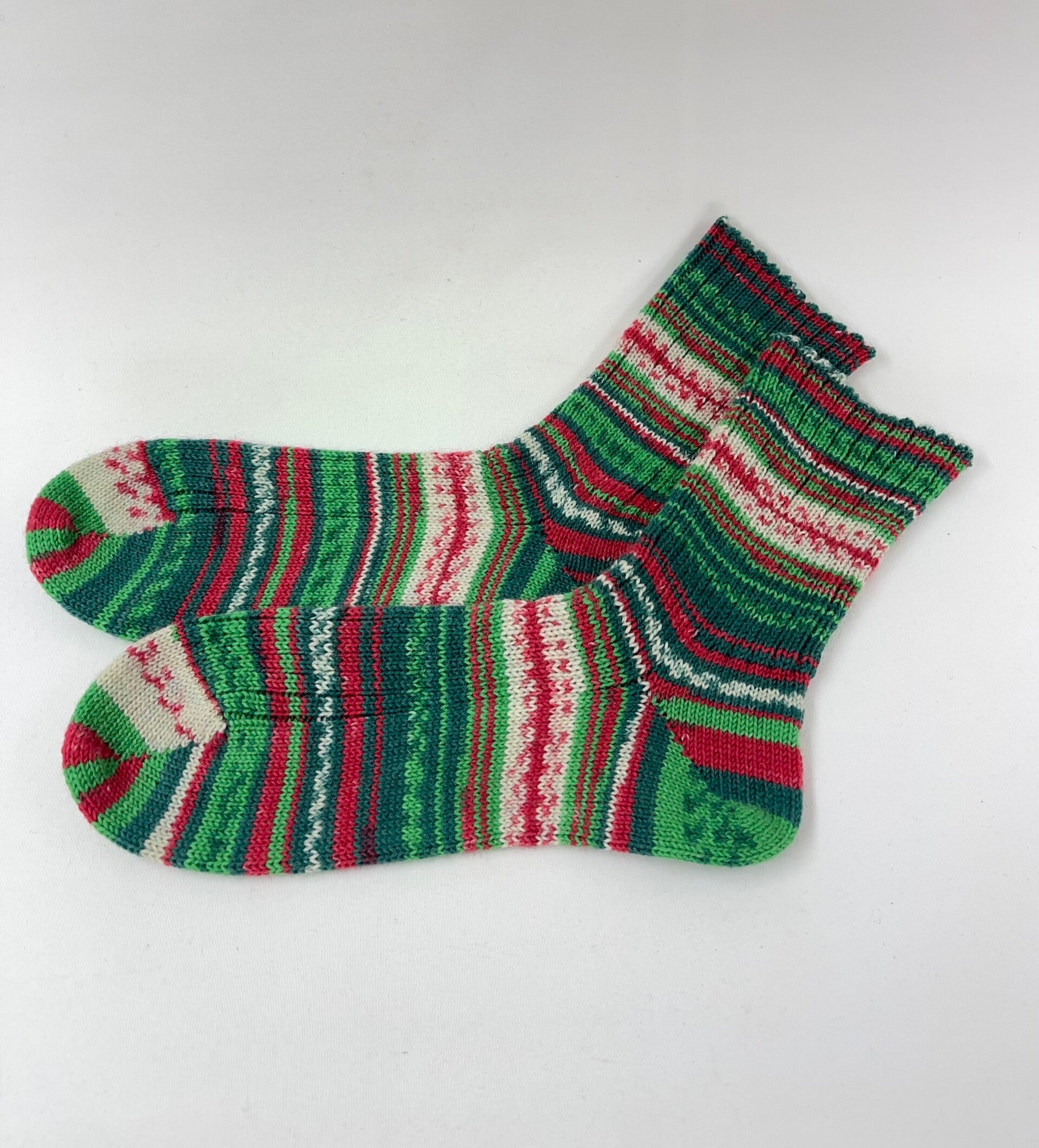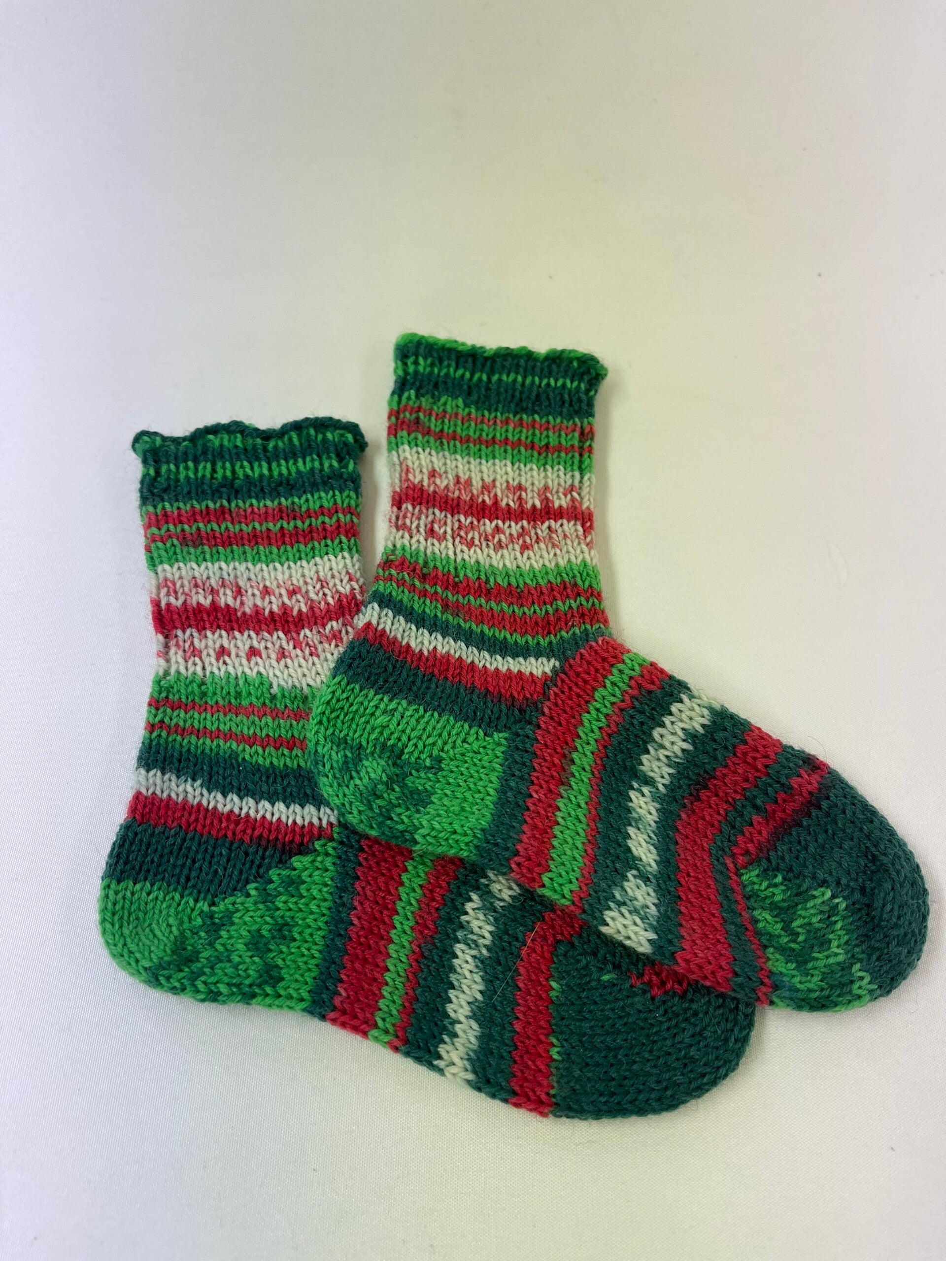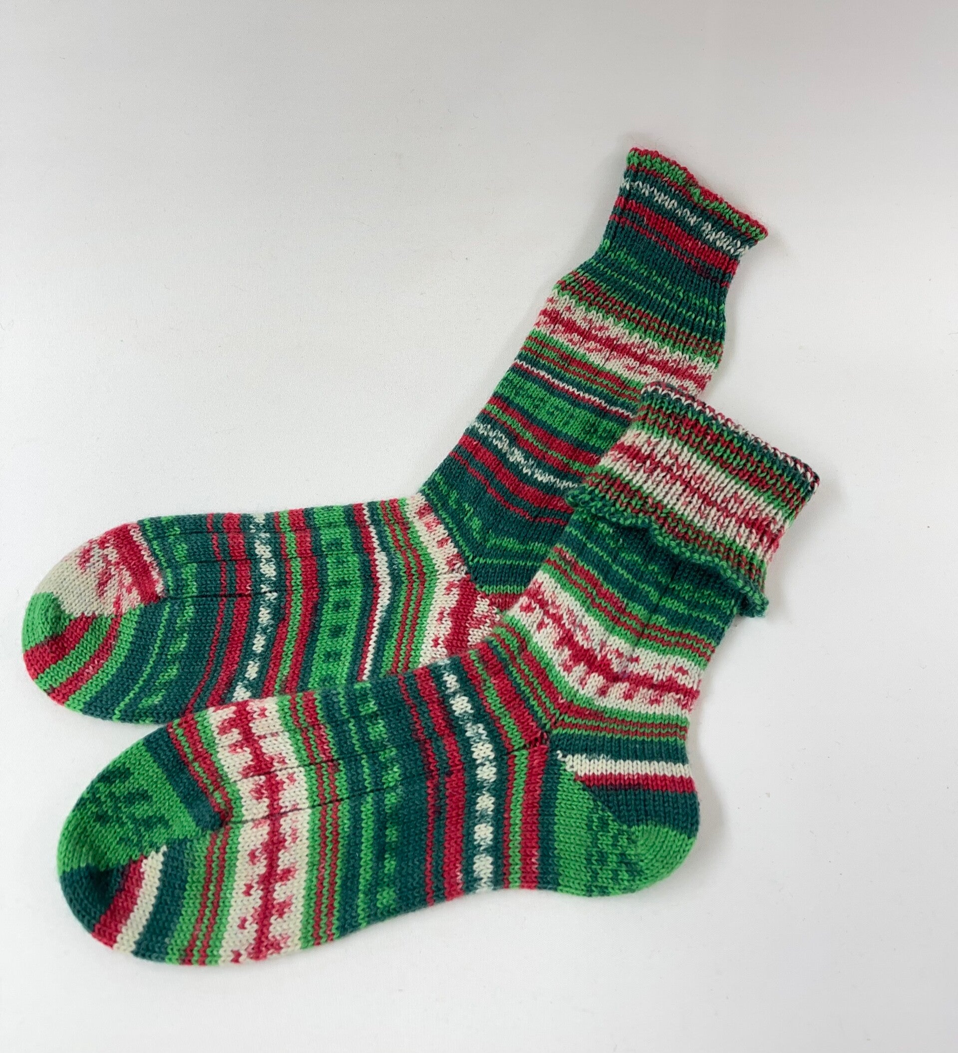 Deze wollen kerst sokken zijn door mij gebreid op een Erlbacher sokkenbreimachine van sokkengaren: 75% superwash scheerwol 25% polyamide. De sokken zijn wasbaar in de wasmachine op de fijn- of wolwas- programma 30 graden met een wolwasmiddel zonder wasverzachter. Droog de sokken niet in de droger.